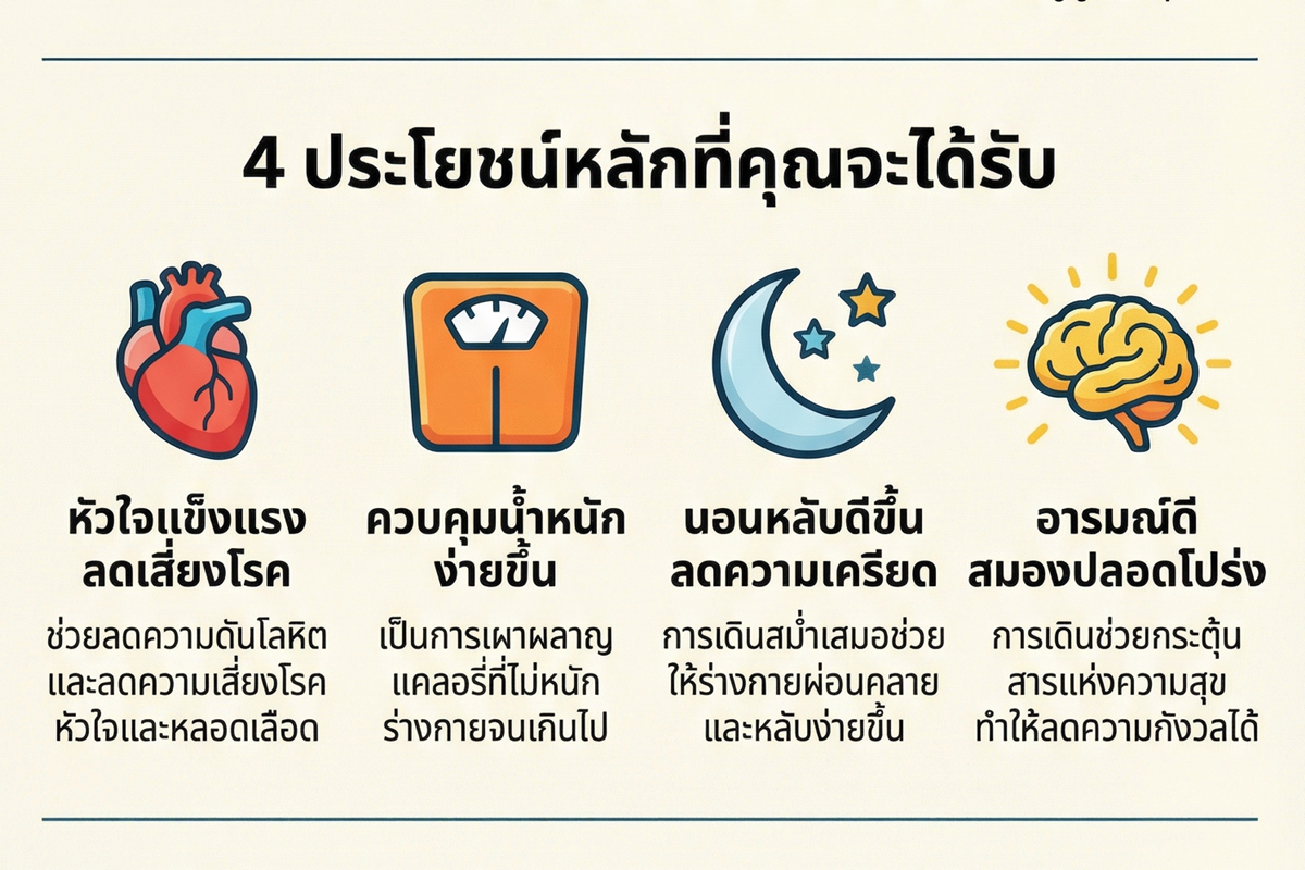 การเดินเป็นการออกกำลังกายที่ง่ายที่สุด ไม่ต้องใช้อุปกรณ์และเหมาะสำหรับทุกวัย การที่นักวิจัยเริ่มปรับแนวคิดจาก 10,000 ก้าวมาสู่ 6,000–8,000 ก้าว เกิดจากการวิเคราะห์ข้อมูลสุขภาพจำนวนมาก ซึ่งมีผลชัดเจนว่า “คุณภาพการเดิน” สำคัญไม่แพ้ “จำนวนก้าว”