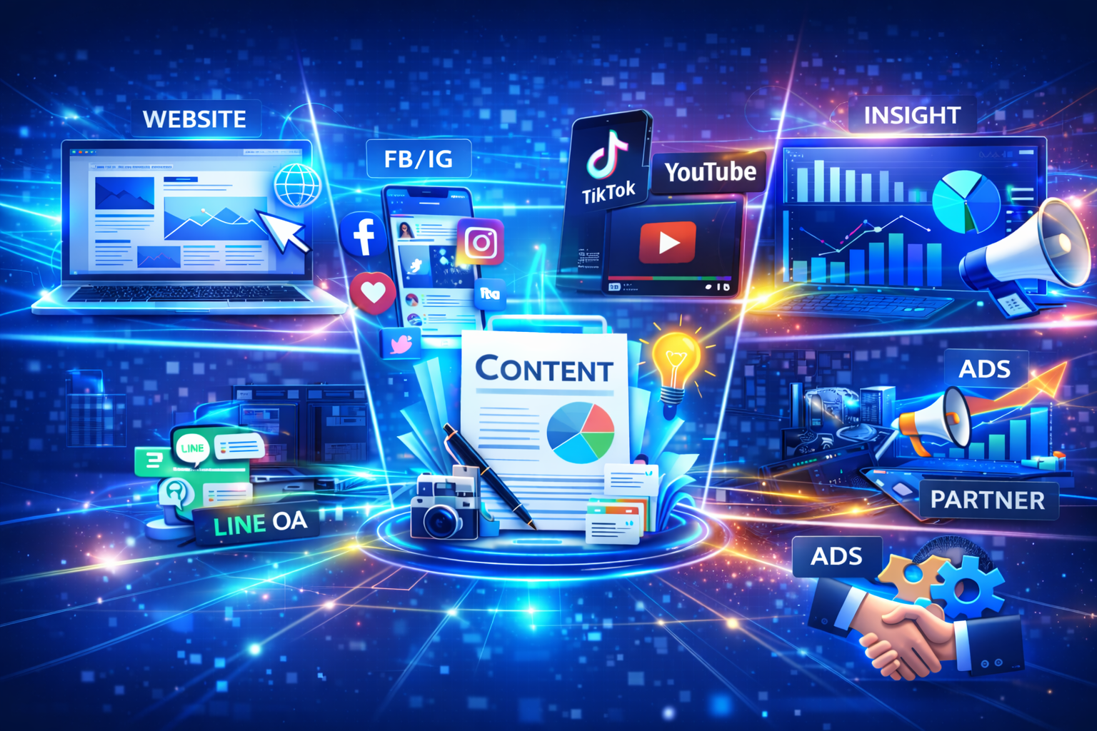 ดูแลหลังบ้านครบวงจร: จัดการทุกช่องทาง (Website, YouTube, Facebook, TikTok, Line, IG) ให้มีความเคลื่อนไหวตลอดเวลา